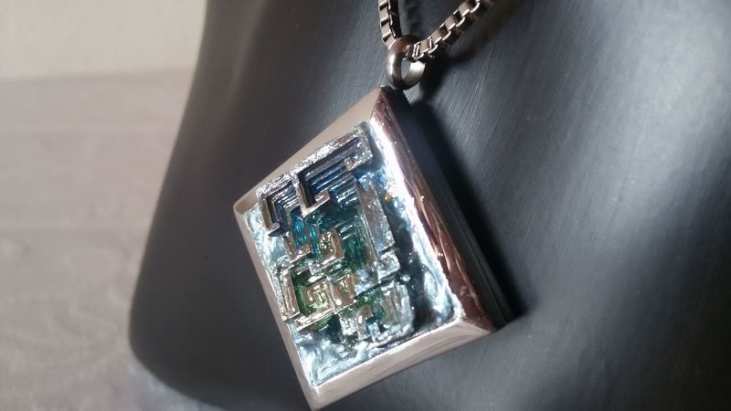 Dieses Collier ist ein ganz besonderes, exklusives Schmuckstück, ein garantierter Blickfang und ein ideales Geschenk! Einzigartige Muster und schillernde Farben des kristallisierenden Metalls Wismut rufen immer wieder Erstaunen hervor. Sehr massiv verarbeitet.
